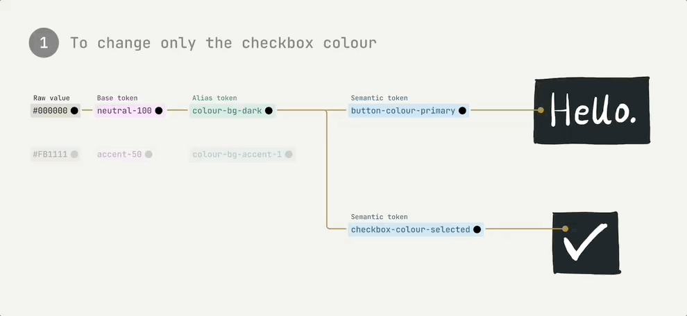 Depending on the scale of what we wanted to change, we could modify either the alias or the semantic token.
