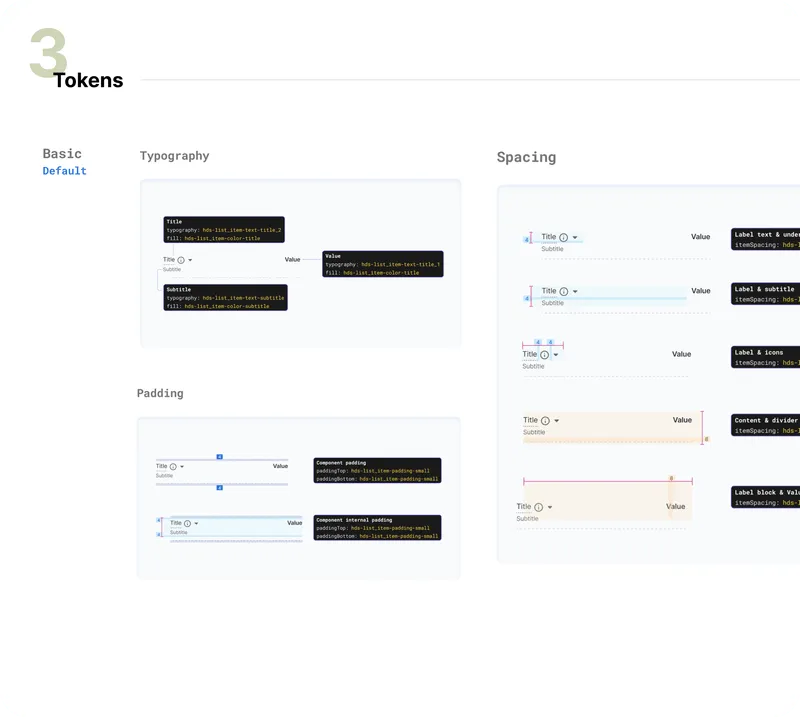 To make this an engineering-friendly system, every fundamental unit of space, size, colour, and typography would have to defined and be represented by a token.